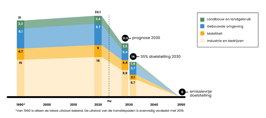 In 1990 bedroeg de uitstoot van broeikasgassen in Noord-Holland 31 Mton CO ₂ -eq (zie Afbeelding 1). In 2019 had Noord-Holland met een uitstoot van 33,1 Mton CO ₂ -eq ongeveer 20 procent van het Nederlandse totaal. Een broeikasgasreductie van 55 procent betekent een maximale uitstoot van 14 Mton CO2-eq voor de provincie in 2030. Met ons huidige klimaatbeleid stoot de provincie Noord-Holland in 2030 circa 30 procent minder CO2-eq uit vergeleken met 1990. Daarmee worden de klimaatdoelstellingen niet gehaald. Hiervoor moet nog een extra uitstootvermindering van 8 Mton CO2–eq plaatsvinden.